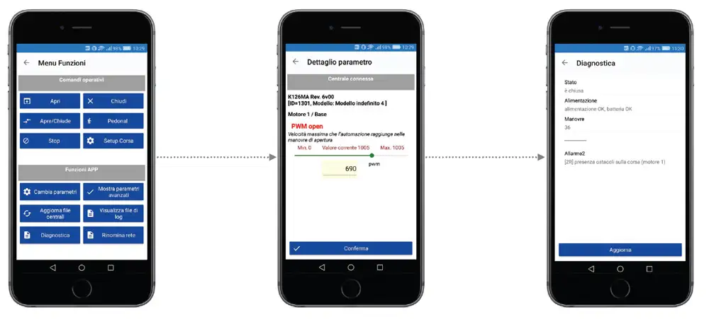 Mit TauApp können Sie die Diagnose des Steuerung direkt von Ihrem Smartphone aus überprüfen, die Einstellungen ändern und die Inbetriebnahme durchführen, ohne direkt am Motor tätig zu werden.