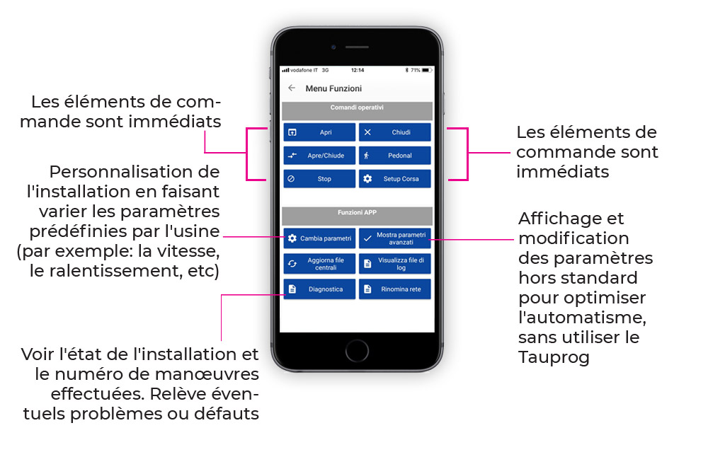 TauApp permet de contrôler vos automatismes directement de votre portable, sans besoin de travailler sur l’opérateur. Grâce à TauApp est possible vérifier le diagnostic de la centrale de commande, faire démarrer l’automatisme et aussi modifier, enregistrer et copier les réglages.